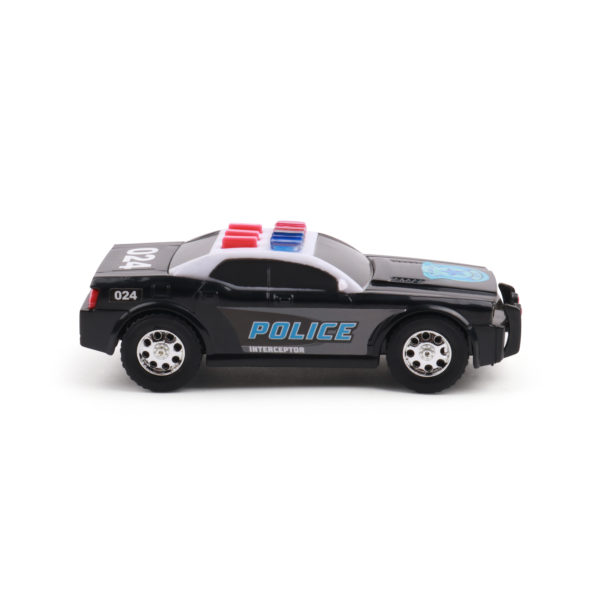 Criminals beware! The Mighty Fleet Toughest Minis Police Cruiser is on patrol. This free-wheeling vehicle comes equipped with three realistic sound sequences and flashing lights to bring play to life! Crafted attention to detail, this mini looks just like a real police cruiser! Includes 2 AAA batteries. Appropriate for ages 3 years and up.